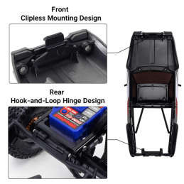 Montage automatique à l'avant et charnière auto-agrippante à l'arrière. Cette charnière auto-agrippante permet d'accéder rapidement au châssis et à la batterie.