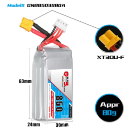 Batterie LiPo GAONENG GNB 3S 11.1V 850mAh 80C XT30 - GNB8503S80A