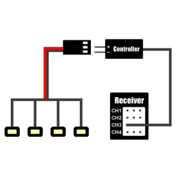 Télécommande : Branchez-la sur un CH3 (ou CH4) et vous pourrez ensuite utiliser les boutons de votre émetteur pour contrôler à distance la lumière et changer de mode.