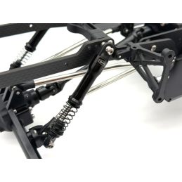 Base prête pour la compétition : Les longerons du cadre en fibre de carbone de 3 mm offrent une base légère mais cohérente rigide, tandis que les biellettes en acier inoxydable de 5 mm et les amortisseurs Reefs XP en aluminium de 90 mm assurent une action de suspension douce et visible.